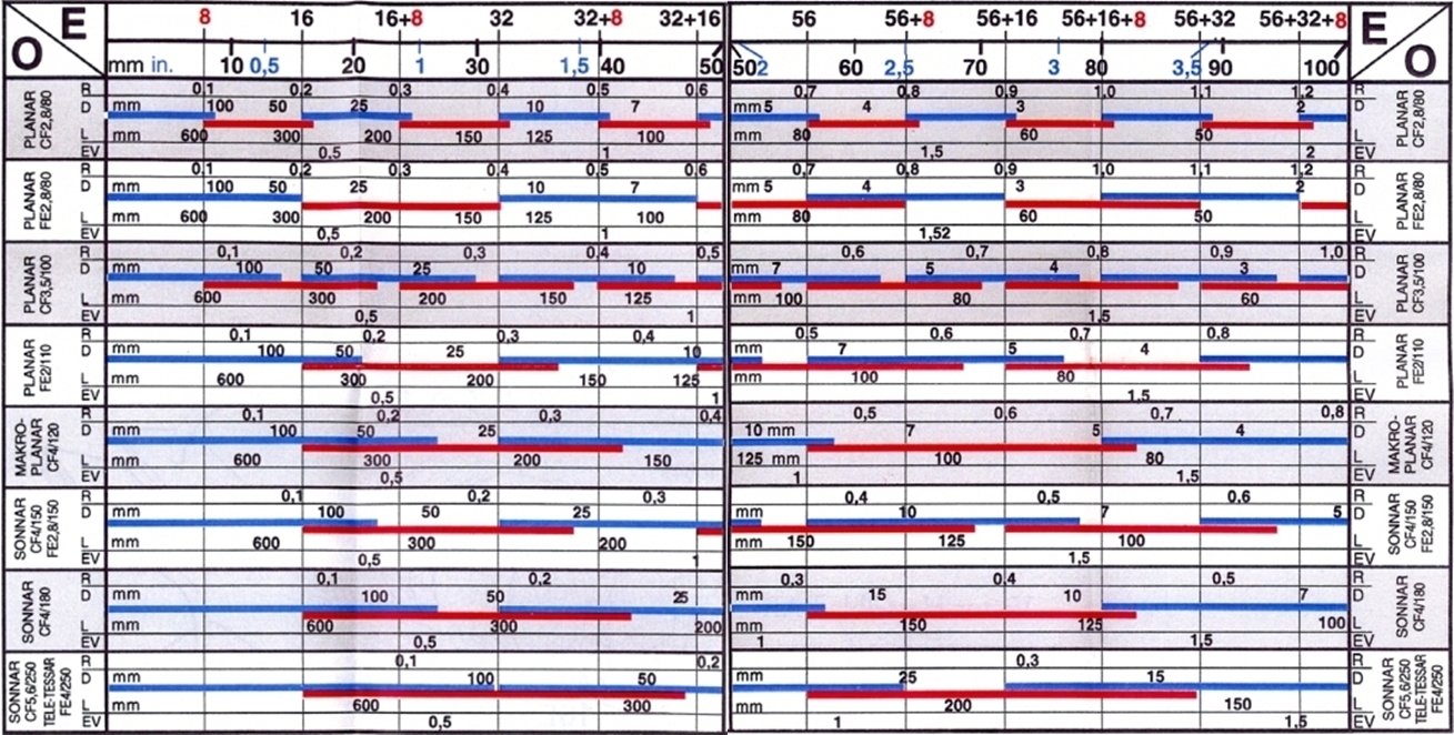 ※ 확장 튜브 또는 확장 튜브 조합에 의한 적용 범위는 확장 튜브 또는 확장 튜브 조합을 나타내는 진한 파란색/빨간색 선의 왼쪽 끝에 있는 가는 세로선으로 정의됨 (다른 튜브 또는 튜브 조합을 구분하기 위해 다른 색으로 표시함) 파란색/빨간색 선의 왼쪽 끝 부분은 렌즈가 무한대 초점일 때를 말하며, 선의 길이는 렌즈의 초점 조절로 인하여 얻은 확장을 의미함. 도표는 실제로는 연속적이지만, 실제적인 이유로 50㎜ 확장에서 나뉘어져 있음