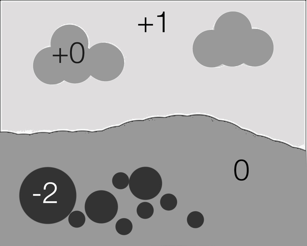 아래는 풍경을 단순화하여 나타낸 도표이다. 도표 안에는 지면이 있으며, 나는 지면을 노출포인트(18% 중간 회색)로 사용하기로 선택했으므로, 스탑 차이가 0이다. 도표의 다른 모든 항목에는 지면과 비교한 노출 차이가 적혀 있다. 실제로 지면은 장면의 다른 모든 것에 대한 우리의 '기준' 지점이라고 할 수 있다. 내가 대부분의 시간을 들여 하는 것이 바로 이것이다. 지면이 18% 회색으로 노출되기를 원한다고 가정하고, 다른 모든 것의 노출 차이가 얼만큼인지 확인한다. 또한 하늘이 완전히 날아가지 않으려면 얼만큼의 그라데이션 필터가 필요한지 확인한다.