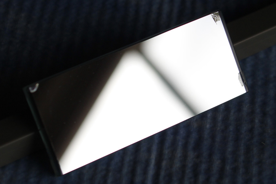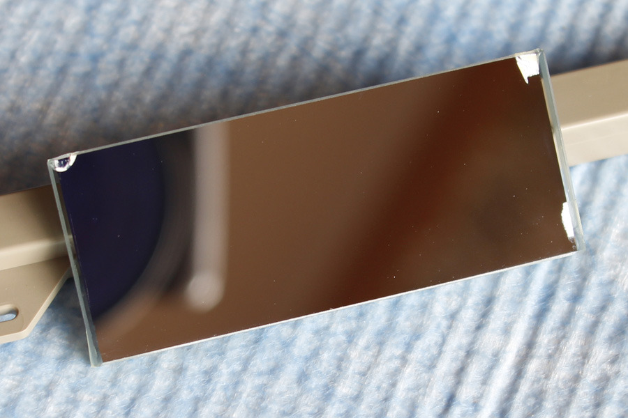 12) 광학 어셈블리를 옆으로 돌리면, 거울이 보인다. 거울은 매우 조심해서 다루어야 한다. 이 거울은 두 겹의 유리 사이에 반사표면이 있는 일반적인 거울과는 달리, 겉면으로 반사 표면이 나와있는 형태의 유리이다. 이 거울의 반사 표면은 매우 얇고, 깨지기 쉬운 코팅 층으로 보호되어 있으나 손으로 만지면 쉽게 긁힐 수 있다. 따라서 절대 손 등의 딱딱한 물체로 거울을 만져서는 안된다. 잘못하면 거울이 영원히 손상된다! 위의 사진에서 보듯이 거울은 하우징에 비스듬한 각도를 두고, 반사 표면이 위로 렌즈를 향하도록 놓여 있다.