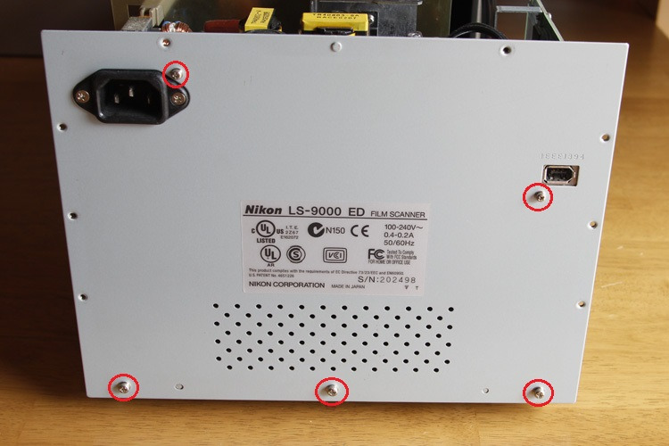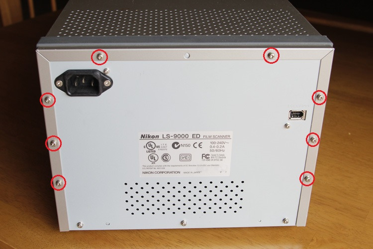 Nikon Super Coolscan LS-9000 disassembly procedure. 1) Remove film trays, power the scanner down, unplug the power & Firewire cables. Set the scanner on a clean surface. 2) Remove these 6 screws on the back of the unit. 3) Remove these 8 screws on the bo
