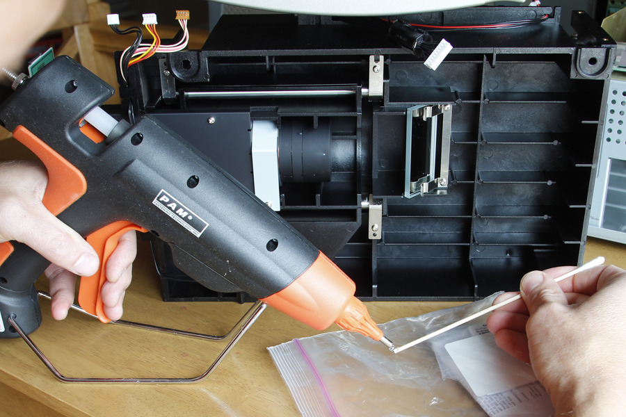19 ) 나는 나무 막대(면봉 등)의 중간 부분을 사용한다. 먼저 뜨거운 글루건을 면봉에 소량 뭍힌 다음, 약간 식은 다음에 바른다. 이 단계가 끝나면 분해의 역순으로 재조립하면 된다.