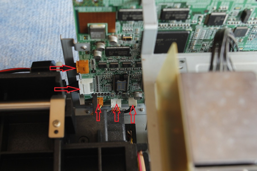 9) 빨간색 화살표로 표시된 5개의 커넥터를 조심스럽게 흔들어 분리한다. 광학 어셈블리를 약간 밀어내면 더 쉬울 수 있다.
