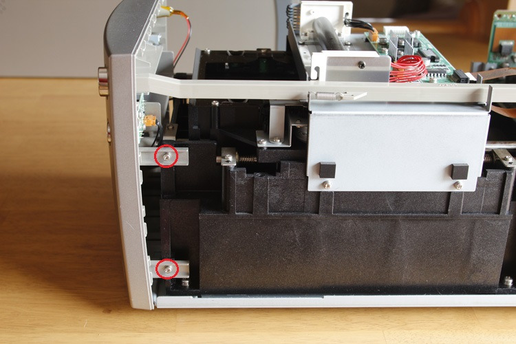 4) 전면 패널을 고정하는 빨간색 원으로 표시된 두 개의 나사를 제거한다. 스캐너 반대편에 있는 나사 두 개 역시 제거한다.