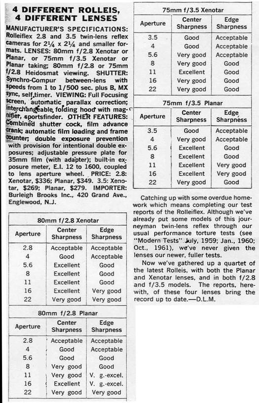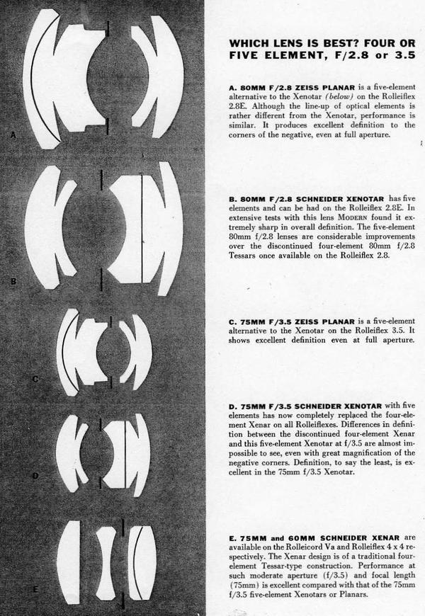 Rolleiflex 라인업의 이러한 개선사항은 TLR 카메라의 최고봉으로서의 입지를 더욱 공고히 했다. 또한 이는 필연적으로 f/2.8과 f/3.5 중 어느 것이 더 우수한가에 대한 질문으로 이어지게 된다. 1956년 5월, Modern Photography는 Rolleiflex 3.5E의 새로운 5매 Xenotar 렌즈를 이전 Rolleiflex의 4매 Tessar 렌즈와 비교하는 기사를 게재했다.